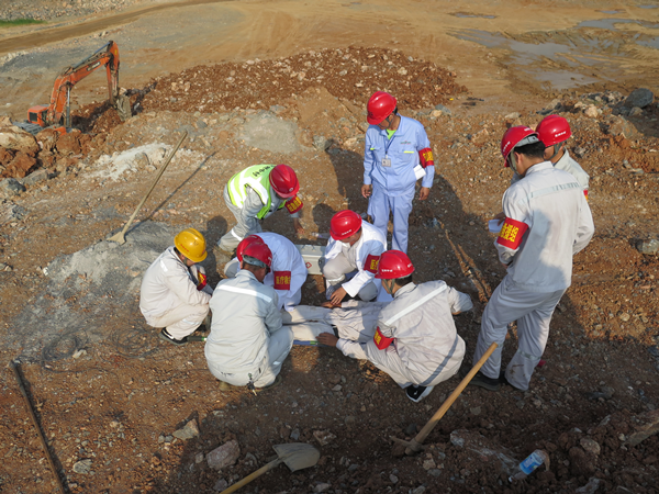 演練模擬礦山施工作業(yè)面35平臺(tái)進(jìn)行爆破作業(yè),由于炮孔充填深度不夠,導(dǎo)致沖孔現(xiàn)象,產(chǎn)生飛石,現(xiàn)場(chǎng)管理人員在礦區(qū)北側(cè)警戒時(shí),被爆破飛石砸中,導(dǎo)致腿部受傷,傷勢(shì)嚴(yán)重。總指揮在接到救援電話后,立即啟動(dòng)三級(jí)應(yīng)急預(yù)案,通知辦公室、各應(yīng)急小組就位。礦山應(yīng)急救援隊(duì)員攜帶專業(yè)救援裝備,駕駛應(yīng)急救援車,拉警報(bào),火速趕赴事故現(xiàn)場(chǎng)。到達(dá)現(xiàn)場(chǎng)后,立即判斷受傷人員傷情,及時(shí)救出并進(jìn)行止血包扎、固定等簡(jiǎn)單處理后由救援隊(duì)員用擔(dān)架抬上120救護(hù)車,并送往就近醫(yī)院救治。演練過程中各應(yīng)急小組各司其職、協(xié)同作戰(zhàn)、反應(yīng)迅速,整個(gè)演練過程在快速、緊張、有序的氛圍中進(jìn)行,圓滿完成了各項(xiàng)預(yù)定任務(wù)。    此次放炮應(yīng)急預(yù)案演練貼近實(shí)戰(zhàn)、分工明確、行動(dòng)迅速、救援工作有條不紊地執(zhí)行。既督促企業(yè)落實(shí)安全主體責(zé)任,指導(dǎo)提高員工的安全隱患意識(shí)和管理能力,確保了黃槽坊礦山的整體安全,又達(dá)到了檢驗(yàn)礦山應(yīng)急救援小組的實(shí)戰(zhàn)和應(yīng)對(duì)突發(fā)事件的應(yīng)急處置能力的目的,更進(jìn)一步檢驗(yàn)了預(yù)案的可操作性和針對(duì)性,為今后突發(fā)生產(chǎn)安全事故下熟練完成救援任務(wù)打下了堅(jiān)實(shí)的實(shí)戰(zhàn)基礎(chǔ)。