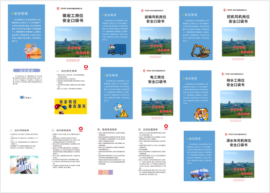 口袋書封面背頁(yè)以安全為主題,與生產(chǎn)相結(jié)合,內(nèi)容包括安全文化標(biāo)語(yǔ)、口號(hào)、個(gè)人安全承諾、具體崗位職責(zé)要求、風(fēng)險(xiǎn)辨識(shí)、操作規(guī)范、隱患排查、應(yīng)急處置等。